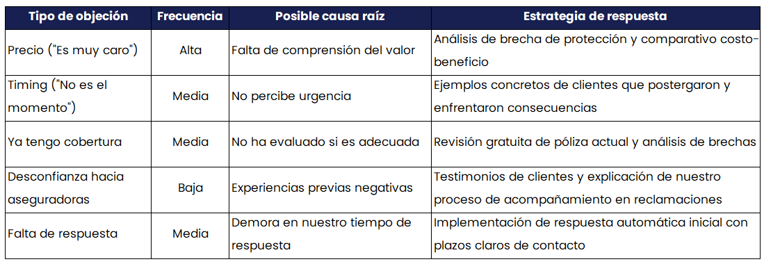 Análisis de tendencias: Si notabamos que el 40% de los prospectos menciona "no necesito más cobertura", revisabamos nuestras presentaciones iniciales para enfatizar las brechas en las pólizas existentes antes de que surja la objeción.